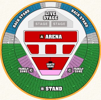 イベント発表後、非常に多くのお客様からお問い合わせをいただいておりました席種の詳細をアップしました。 AIR JAM 2011では3種類の席種をご用意いたしました。 ■ ライブを思いきり盛り上がりたい方は 【A.アリーナスタンディング】 ■ ゆったりと座りながらライブを楽しみたい方は 【B.スタンド指定席】 ■ ご家族でライブを満喫したい方は 【C.ファミリーゾーン】 ■TICKETSページはこちら>> |