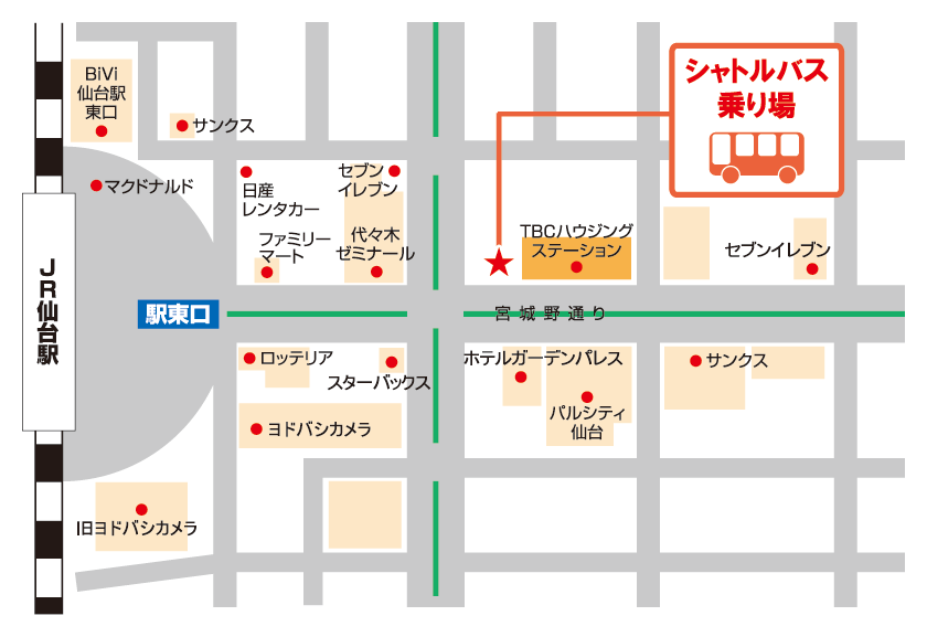 電車をご利用の方は、会場から徒歩圏内に駅はありませんので、仙台駅からのシャトルバスをご利用ください。
